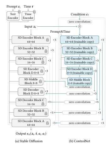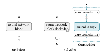 ControlNet模型的最小单元结构中有两个zero convolution模块,它们是1×1卷积,并且权重和偏置都初始化为零。这样一来,在我们开始训练ControlNet之前,所有zero convolution模块的输出都为零,使得ControlNet完完全全就在原有Stable Diffusion底模型的能力上进行微调训练,