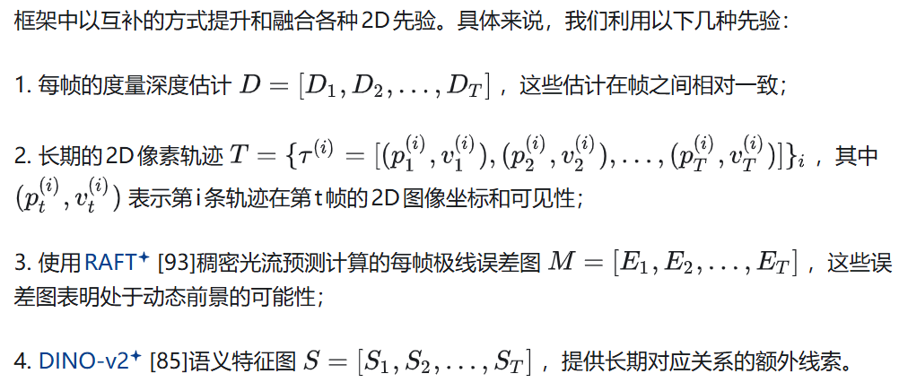 这里讲了有哪些先验,单目视频输入到哪些基础模型获得了哪些信息。
