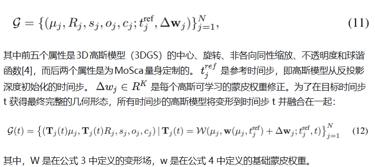 MoSca 的一个重要特点是,其全局变形场可以全局随时变换点,从而能够将所有观察到的视频帧融合成一个单一的相干表示。在系统的最后一步,优化后的 MoSca 收集从所有时间步长的反向投影前景深度点初始化的 3D 高斯。这里定义了3dgs的属性