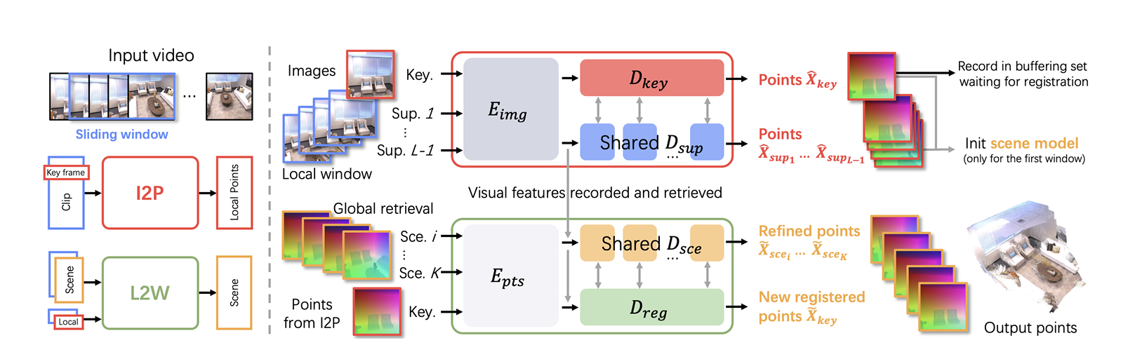 - 也是一个将视频分为重叠子图的方法,分别传入DUSt3R为基础的一个模型,这个模型的优点是每个子图能在关键帧坐标系建立子图滑动窗口机制将输入的单目RGB视频转换为重叠片段,先由Image-to-Points(I2P)网络从每个窗口中重建局部3D点云。