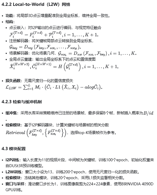 - 用深度学习的方法解决不同子图局部坐标系对齐问题:局部到世界模块Local-to-World(L2W)直接将预测的局部 3D 点图对齐到统一的全局坐标系中。这消除了显式相机参数估计和昂贵的全局优化的需要。