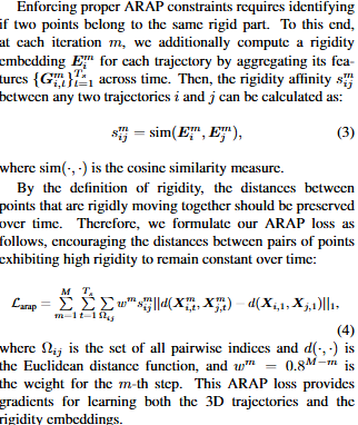 3D 跟踪点的一个优点是我们可以强制执行尽可能刚性 (ARAP) 约束,这增强了空间一致性并有助于预测运动,尤其是在遮挡期间。要实施适当的 ARAP 约束,需要确定两个点是否属于同一刚性零件。为此,在每次迭代 m 中,我们还通过聚合其特征 {G} (通过光谱聚类来获得查询像素的分割计算获得)来计算每个轨迹的刚度嵌入 E。然后,任意两个轨迹 i 和 j 之间的刚性亲和力 s 可以计算出来。