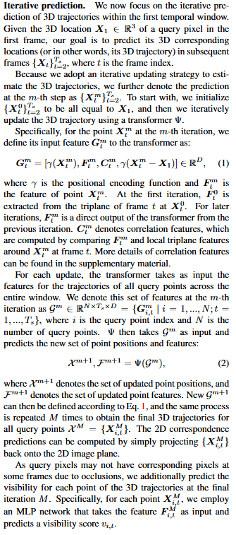 现在专注于第一个时间窗口内 3D 轨迹的迭代预测。给定第一帧中查询像素的 3D 位置预测其在后续帧中的 3D 对应位置。