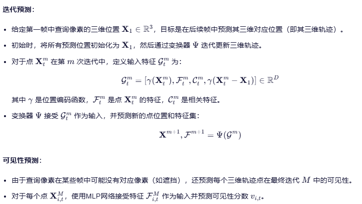 - 随后,我们通过基于三平面表示的特征,利用 Transformer 预测迭代更新,计算查询像素的三维轨迹。