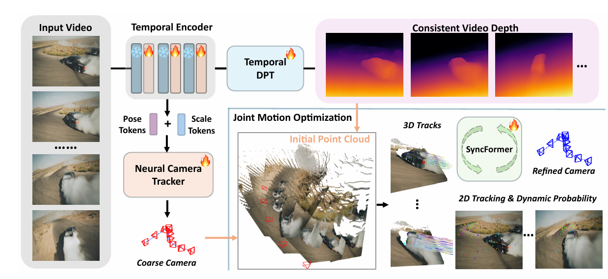 为应对这些挑战,我们将三维点跟踪分解为三个独立的组成部分:视频深度、相机运动和物体运动,并将它们集成到一个完全可微分的管道中,支持在异构数据上的可扩展联合训练。