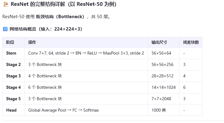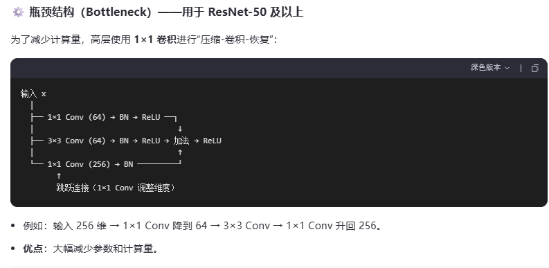 - 瓶颈结构(Bottleneck)用于 ResNet-50 及以上